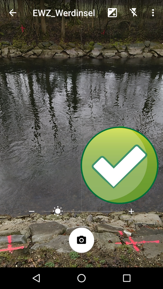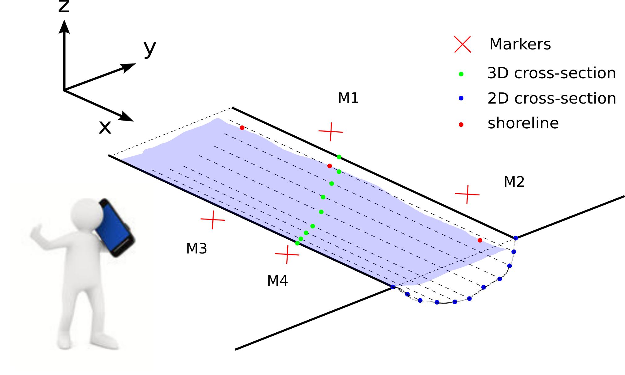Second, it is very important to make a maximal use of the field of view provided by the camera of your smartphone, so that the river cross-section can be captured at a resolution as high as possible. Therefore, the markers on the far shore should be more distant from another than the ones on the near shore. Before performing the measurement, make sure that your position and the orientation of the smartphone allows you to maximize the area covered by the river cross-section in the field of view.