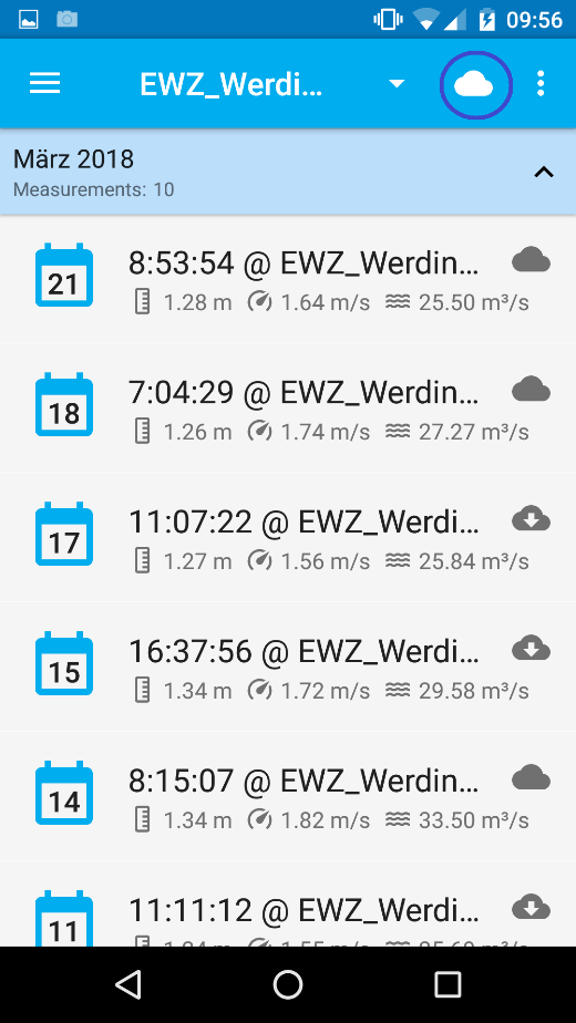 In the measurements tab, by selecting the cloud button, you can choose between showing measurements that saved locally on your device or that were already updated to the cloud.