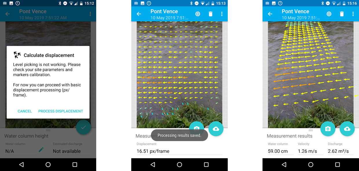 Possibility of calculating the displacement (left), displacement field in pixels per frame (middle) and velocity field at the surface of the river, once the site is calibrated (right).